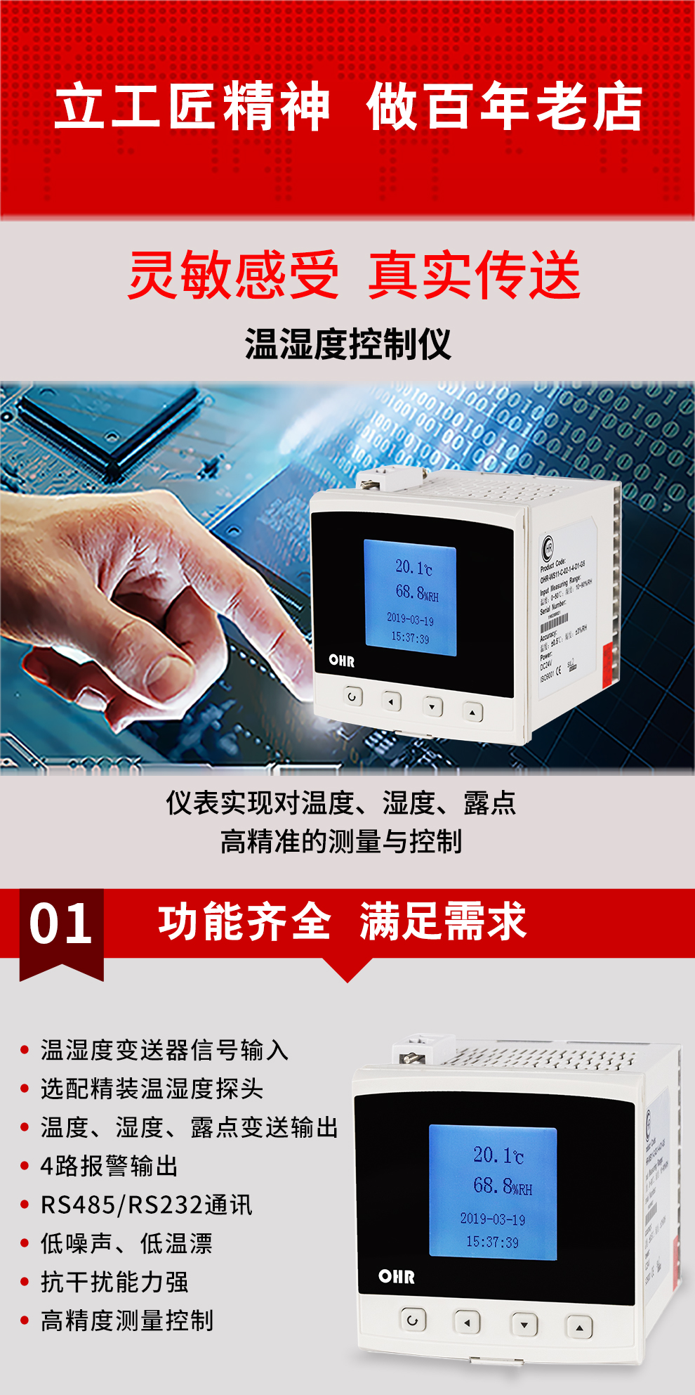虹潤(rùn)公司是專業(yè)生產(chǎn)環(huán)境監(jiān)測(cè)儀表的國(guó)家專精特新“小巨人”企業(yè)。生產(chǎn)的盤(pán)裝式溫濕度控制器,具有溫度、濕度、露點(diǎn)高精準(zhǔn)的測(cè)量,壁掛式結(jié)構(gòu),IP65防護(hù)穩(wěn)定性強(qiáng),高抗干擾,帶RS485/RS232通訊輸出等級(jí)等特點(diǎn)。產(chǎn)品獲得一種手持式低功耗溫濕度檢測(cè)儀、大屏幕溫濕度記錄儀等2項(xiàng)國(guó)家發(fā)明專利,主持起草物聯(lián)網(wǎng)智能溫度儀表通用技術(shù)條件、冷鏈溫度記錄儀等2項(xiàng)國(guó)家標(biāo)準(zhǔn),通信系統(tǒng)多通道數(shù)據(jù)采集控制終端規(guī)范軍用標(biāo)準(zhǔn),以及現(xiàn)場(chǎng)設(shè)備集成等5項(xiàng)智能制造國(guó)家標(biāo)準(zhǔn),參與國(guó)際5G標(biāo)準(zhǔn)制定,取得溫濕度儀表等2項(xiàng)相關(guān)軟件著作權(quán)。產(chǎn)品廣泛應(yīng)用于工業(yè)現(xiàn)場(chǎng)、農(nóng)業(yè)大棚、倉(cāng)儲(chǔ)物流、地下管廊、養(yǎng)殖孵化、配電機(jī)房等諸多領(lǐng)域。