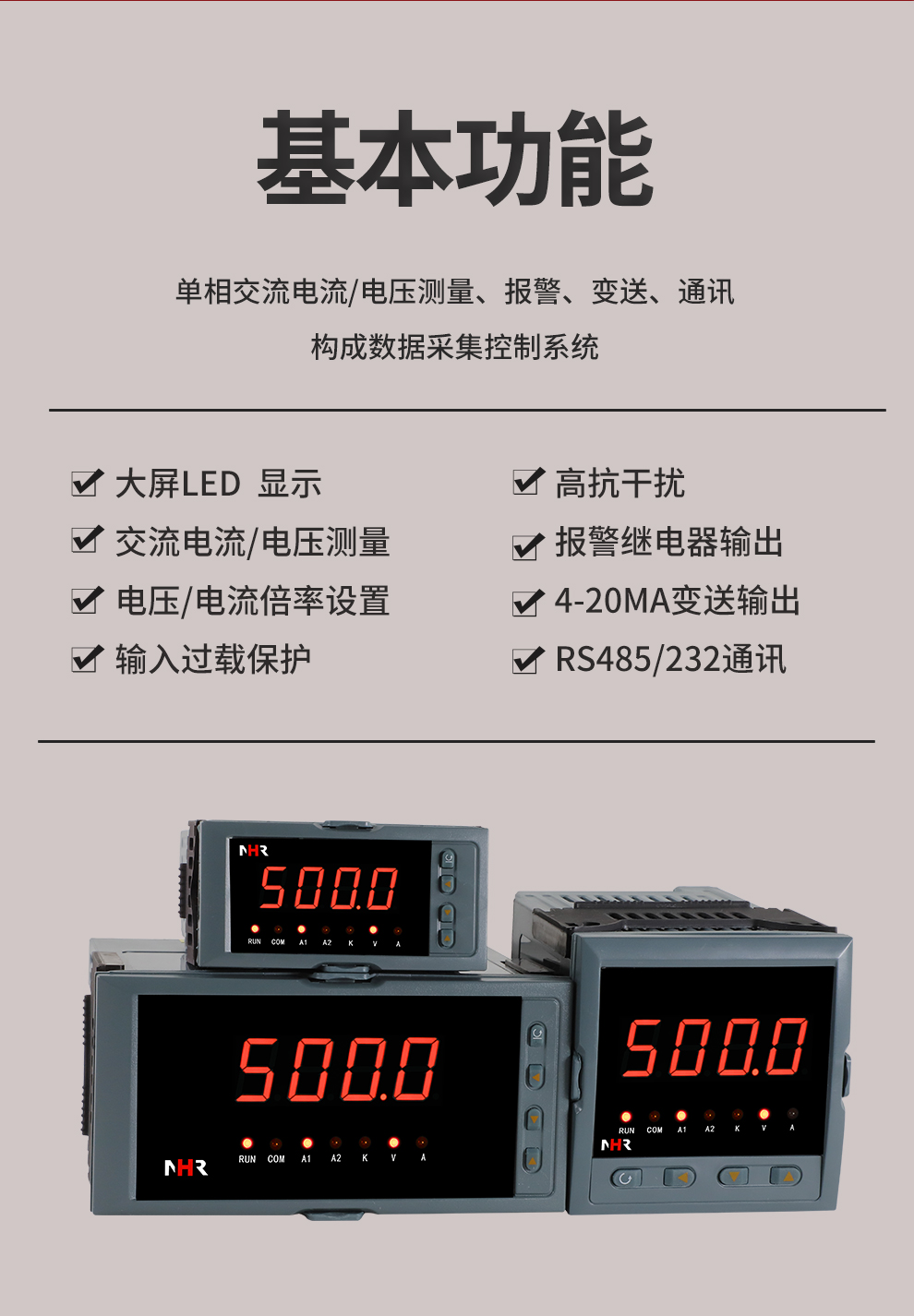 虹潤(rùn)公司是專(zhuān)業(yè)生產(chǎn)數(shù)字電壓表的國(guó)家專(zhuān)精特新“小巨人”企業(yè),生產(chǎn)的交流電壓/電流表,具有大屏LED顯示,電流電壓倍率設(shè)置,高抗干擾,輸出過(guò)載保護(hù),RS485/RS232通訊等特點(diǎn)。產(chǎn)品獲得一種交流信號(hào)變送器、交直流信號(hào)轉(zhuǎn)換電路、基于DCS技術(shù)的盤(pán)裝式三相電量表等3項(xiàng)國(guó)家發(fā)明專(zhuān)利,主持起草工業(yè)過(guò)程控制系統(tǒng)用模擬輸入兩位或多位輸出儀表國(guó)家標(biāo)準(zhǔn),直流漏電流傳感器規(guī)范、通信系統(tǒng)多通道數(shù)據(jù)采集控制終端規(guī)范等2項(xiàng)軍用標(biāo)準(zhǔn),以及現(xiàn)場(chǎng)設(shè)備集成等5項(xiàng)智能制造國(guó)家標(biāo)準(zhǔn),參與國(guó)際5G標(biāo)準(zhǔn)制定。取得單相電量?jī)x表等2項(xiàng)相關(guān)軟件著作權(quán)。產(chǎn)品廣泛應(yīng)用于工業(yè)制造、建筑地產(chǎn)、機(jī)電設(shè)備、能源電力、市政設(shè)施 、數(shù)據(jù)中心與通信等諸多領(lǐng)域。